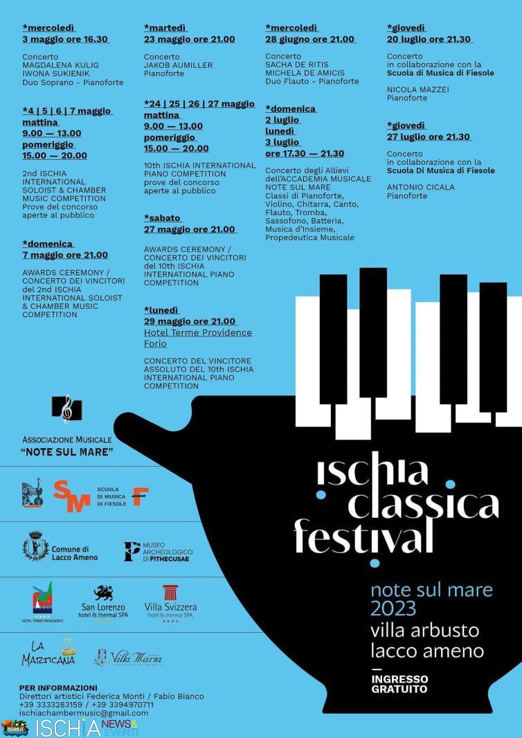 Ischia Classica Festival – Note sul mare 2023 è organizzato dall’Associazione musicale Note sul Mare e promosso con il sostegno del Comune di Lacco Ameno. Partner: Museo archeologico Pithecusae, Scuola di Musica di Fiesole, Hotel Terme Providence, San Lorenzo Hotel Thermal Spa, Villa Svizzera Hotel Thermal & Spa, La Marticana, Villa Maria.